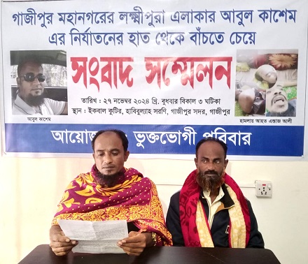 গাজীপুর প্রতিনিধি: প্রেম করে প্রেমিক-প্রেমিকা পালিয়ে যাওয়ার ঘটনায় ছেলের বাবাকে হাত-পা বেঁধে নির্মমভাবে পিটিয়েছে মেয়ের বাবা ও তার সহযোগীরা। বেদড়ক পেটানোর পর ৪টি সাদা কাগজে স্বাক্ষর নেয়ার পর ৯৯৯ এর সহযোগিতা পুলিশ উদ্ধার করে ছেলের বাবাকে। ঘটনাটি গাজীপুর সদর থানাধীন লক্ষীপুরা এলাকার। গতকাল বুধবার নগরীর একটি স্থানীয় পত্রিকা অফিসে এসে সংবাদ সম্মেলনের মাধ্যমে নির্যাতনের বর্ণনা দেন ভুক্তভোগী ছেলের বাবা মো: এন্তাজ আলী। সিরাজগঞ্জের উল্লাপাড়া থানাধীন কয়ড়া এলাকার বাসিন্দা এন্তাজ গাজীপুরের লক্ষীপুরা এলাকার রোকনের বাড়ির ভাড়াটিয়া। তিনি লক্ষীপুরা তিন সড়কের লাল মিয়া মার্কেটে কসমেটিক্সের ব্যবসা করেন। লিখিত বক্তব্যে এন্তাজ আলী বলেন, আমার বর্তমান ঠিকানা ভাড়া বাসা সংলগ্ন প্রতিবেশী আবুল কাসেমে এর মেয়ে জান্নাতুল ফেরদৌস কনা (১৮) এর সাথে আমার ছেলে মো. নাজমুল (২১) এর প্রেমের সম্পর্ক ছিলো এটা আমি শুনেছি। পরে আমার ছেলেকে আমি আবুল কাসেমের মেয়ের সাথে যোগাযোগ রাখতে নিষেধ করি। গত ১৬ নভেম্বরের পর থেকে আমার ছেলেকে খুঁজে পাচ্ছি না। তখন এলাকাবাসী অনেকের মুখে শুনতে পাই আমার ছেলে নাজমুল ও কাসেমের মেয়ে কনা অজ্ঞাত স্থানে পালিয়ে গেছে। তাদের পালিয়ে যাওয়ার ঘটনাকে কেন্দ্র করে পরবর্তীতে আবুল কাশেম ও তার সহযোগি মোঃ হাসেম, বেলায়েত যোগসাজস করে আমাকে দোষারপ করে এবং কাসেমের মেয়েকে খুঁজে দেয়ার জন্য হুমকি প্রদান করে। গত ২১ নভেম্বর বিকেলে আবুল কাশেম আমার ভাড়া বাসায় এসে আমাকে তার সাথে যেতে বলে। আমার ভাড়া বাসা হতে বের হওয়া মাত্রই আগে থেকে উৎপেতে থাকা হাসেম ও বেলায়েত আমাকে রশি দিয়া বেঁধে ফেলে। এরপর আবুল কাশেম, হাসেম ও বেলায়েত আমাকে রাস্তায় ফেলে জনসম্মুখে বেদড়ক মারপিট করতে থাকে। আমাকে বাঁচাতে আমার ছোট মেয়ে মিম (১৬) এগিয়ে আসলে আবুল কাশেম তার চুলের মুঠি ধরে রাস্তায় ফেলে দিয়ে পেটাতে থাকে। একপর্যায়ে আবুল কাশেম ও বেলায়েত ফিল্মি স্টাইলে রশি দিয়ে আমার দুই হাত এবং গামছা দিয়ে আমার দুই চোখ বেঁধে অটোরিক্সায় তুলে নিয়ে বাংলাদেশ ধান গবেষণাস্থ কবরস্থান সংলগ্ন একটি নির্জন স্থানে নিয়ে যায়। এরপর সেখানে নিয়ে আমাকে নির্যাতন করে আমার মাথা, বুক, পিঠ, কোমড়, দুই উরুসহ শরীরের বিভিন্ন জায়গায় মারাত্মক জখম করে। এক পর্যায়ে আবুল কাশেমের হুকুমে হাসেম ও বেলায়েত ধারালো চাকু বের করে আমার গলায় ধরে আমাকে সহ পরবর্তীতে আমার স্ত্রী-সন্তানকে জানে মারিয়া ফেলার ভয়-ভীতি ও হুমকি দিয়া তাহাদের আনিত ৪টি সাদা কাগজে আমার ইচ্ছার বিরুদ্ধে একাধিক স্বাক্ষর নেয়। পরবর্তীতে ঘটনার দিন রাত ১১টার দিকে আমার বড় ছেলে মো: মাহাবুব (২২) আমার জীবন রক্ষায় ৯৯৯ নম্বরে কল করে সাহায্য 
