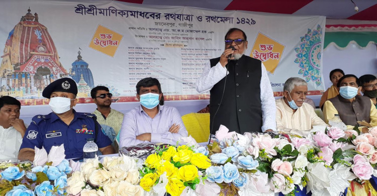 জাহাঙ্গীর আকন্দ : মুক্তিযুদ্ধ বিষয়ক মন্ত্রী আ.ক.ম মোজাম্মেল হক বলেছেন, ‘বঙ্গবন্ধু বলতেন আমার ধর্ম আমার, তোমার ধর্ম তোমার। অর্থাৎ যার যার ধর্ম সে স্বাধীনভাবে পালন করবে। রাষ্ট্র তাতে কোন প্রকার বাধা দেবে না। প্রত্যেকটি নাগরিক সমান অধিকার ভোগ করবে। তার কণ্যা মাননীয় প্রধানমন্ত্রীও বলেন ধর্ম যার যার উৎসব সবার। জননেত্রী দেশের জন্য শুধু পদ্মা সেতু নির্মাণ নয়, তিনি ১০টাকা মূল্যের ভিজিএফ’র চাল, কর্নফুলি টানেল নির্মাণসহ বিভিন্ন উন্নয়নমূলক কাজ করে যাচ্ছেন। তিনি প্রধানমন্ত্রীর জন্য উপস্থিত পূন্যার্থীসহ সকলের কাছে দোয়া ও আশির্বাদ চেয়েছেন।’ আজ শুক্রবার সকালে শহরের গাজীপুর প্রেসক্লাবের সামনে বটমূলে শ্রীশ্রী মানিক্য মাধবের রথযাত্রা ও রথমেলা’র উদ্বোধনী অনুষ্ঠানে প্রধন অতিথির বক্তব্যে মন্ত্রী এসব কথা বলেন। উদ্বোধনী অনুষ্ঠানে সভাপতিত্ব করেন গাজীপুরের জেলা প্রশাসক আনিসুর রহমান।