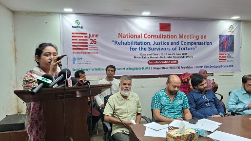 মায়ের ডাক ফাউন্ডেশন, মানবাধিকার উন্নয়ন কেন্দ্র (HRDC) এবং ছওয়াব (SWAB) এর পক্ষ থেকে নির্যাতিতদের সমর্থনে জাতিসংঘ ঘোষিত আন্তর্জাতিক দিবস (২৬ জুন) পালনের জন্য একটি জাতীয় পরামর্শ সভায় তিনি প্রধান অতিথির বক্তব্যে এসব কথা বলেন। তিনি আরো বলেন, রাষ্ট্রীয় বাহিনী কর্তৃক হেফাজতে নির্যাতনের শিকার ব্যক্তিবর্গের বিচার, পুনর্বাসন ও ক্ষতিপূবরণের ব্যবস্থা নিশ্চয়ই আমরা করবো।