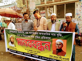 ২৮ ফেব্রুয়ারি, মঙ্গলবার, বিকাল ৩ টায় প্রেসক্লাবের সামনে ‘ন্যাশনাল সবুজ বাংলা পার্টি’র (এনএসবি পার্টি ) উদ্যোগে দ্রব্যমূল্যের উর্ধ্বগতি, হজ প্যাকেজের অস্বাভাবিক মূল্য বৃদ্ধি, গ্যাস ও বিদ্যুতের দাম বৃদ্ধি’র প্রতিবাদে আয়োজিত মানববন্ধনে বক্তাগণ উপরোক্ত কথা বলেন।