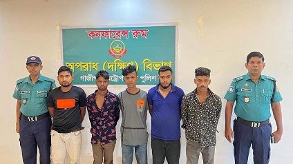 গ্রেপ্তারকৃতরা হলেন, ময়মনসিংহ জেলার কোতয়ালী থানার কুড়ারাকান্দা গ্রামের নূর ইসলামের ছেলে সোহেল মিয়া(২২),গাজীপুরের পূবাইল থানার হারবাইদ এলাকার মৃত জয়নাল আবেদিনের ছেলে জুনায়েদ হোসেন জুনু(১৯),ময়মনসিংহ জেলার নান্দাইল থানার কড়ইকান্দি গ্রামের হারিছের ছেলে হৃদয়(২১),টঙ্গীর পাগাড় এলাকার মৃত শহিদুল ইসলামের ছেলে রাসেল ওরফে বাবু(২৬) ও রাজবাড়ি জেলার গোয়ালন্দ থানার লাল মিয়ার ছেলে রোমান(১৮)।