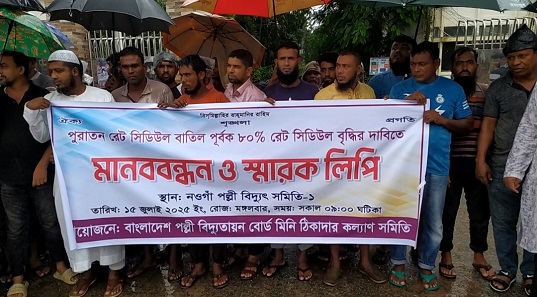 জেলা প্রতিনিধি নওগাঁ’বৈষম্য নিপাত যাক-পল্লী বিদ্যুৎতায়ন বোর্ড মিনি ঠিকাদার কল্যাণ সমিতি ৮০% সিডিউল রেট বৃদ্ধি মুক্তি পাক’ এই স্লোগানকে সামনে রেখে নওগাঁ পল্লী বিদ্যুৎতায়ন বোর্ড মিনি ঠিকাদার কল্যাণ সমিতির বৈষম্য দূরীকরণ হক এই দাবীতে নওগাঁয় টানা ১ ঘন্টা মানব বন্ধন করেছেন নওগাঁ পল্লী বিদ্যুৎতায়ন বোর্ড মিনি ঠিকাদার সমিতির ঠিকাদারেরা । নওগাঁ পল্লী বিদ্যুৎতায়ন বোর্ড ঠিকাদার সমিতি ৮০% সিডিউল রেট বৃদ্ধির জন্য মঙ্গলবার (১৫ জুলাই) বেলা ২ টার সময় নওগাঁ শহরের চকবিরাম নওগাঁ পল্লী বিদ্যুৎতায়ন সমিতি-১ এর কার্যালয় সামনে এই মানব বন্ধন অনুষ্ঠিত হয় । নওগাঁ পল্লি বিদ্যুৎতায়ন সমিতি ১ ও ২ ঠিকাদার সমিতির সভাপতি মোঃ মোজাহার হোসেন হিরার সভাপতিত্বে উক্ত মানব বন্ধনে বক্তব্য রাখেন বাংলাদেশ পল্লী বিদুৎতায়ন বোর্ড মিনি ঠিকাদার সমিতির সভাপতি মোঃ আমিনুল ইসলাম, ঠিকাদার মোঃ কামাল হোসেন রিপন, মোঃ সাজ্জাদ হোসেন, মোঃ রাশেদুল ইসলাম রাজু সহ প্রমুখ । এই মানব বন্ধনে বক্তারা বক্তব্যে বলেন আমরা বাংলাদেশের বিদ্যুৎ ব্যবস্থা সচল রাখার জন্য সর্বদা দিন রাত কাজ করে যাচ্ছি । আমরা সিডর,আইলা,পরিমেল এমনকি করোনা মহামারির সময় আমরা জীবনের ঝুঁকি নিয়ে বিদ্যুৎ সচল রেখেছি । বক্তারা আরো বলেন বর্তমানে কক্সবাজার, চট্টগ্রাম, ফেনী, নোয়াখালী, কুমিল্লা, চাঁদপুর, সিলেট, বরিশাল, ভোলা, বরগুনা, পটুয়াখালী, খুলনা এবং যশোর সহ বিভিন্ন অঞ্চলে অতিরিক্ত বৃষ্টির কারণে ও বন্যায় ক্ষতিগ্রস্ত বিদ্যুৎ লাইন জরুরী ভিত্তিতে রক্ষণাবেক্ষণ করে বিদ্যুৎ সচল রাখতে আমাদের সকল ঠিকাদারের প্রতিষ্ঠান দিনরাত পরিশ্রম করে যাচ্ছে । আমাদের সকল ঠিকাদারি প্রতিষ্ঠানে হাজার হাজার জনবল দিনরাত পরিশ্রম না করলে আজ বাংলাদেশ পল্লী বিদ্যুৎতায়ন বোর্ড ও পল্লী বিদ্যুৎ সমিতি জনগণের আস্থা অর্জন করতে সক্ষম হতো না । বাংলাদেশের সব কিছু দাম বৃদ্ধি পায় কিন্তু আমাদের ঠিকাদারি প্রতিষ্ঠানের সিডিউলের রেট বৃদ্ধি পায় না। উল্লেখ্য থাকে যে ২৮/০২/২০১৭ ইং তারিখের সর্বশেষ রেড সিডিউল বৃদ্ধি করা হয় । আমরা ৮০টি পল্লী বিদ্যুৎ সমিতি নিয়োজিত মিনি ঠিকাদারী প্রতিষ্ঠানগুলো মানববন্ধন ও স্মারকলিপির মাধ্যমে অবগত করছি যে যথাযথ কর্তৃপক্ষ ( চেয়ারম্যান মহোদয়) নিকট আলাপ আলোচনা পূর্বক অতিদ্রæত আমাদের শ্রমিক নিয়ে বেঁচে থাকার তাগিদে ৮০% রেট সিডিউল বৃদ্ধির জন্য সবিনয় অনুরোধ জানাচ্ছি । বক্তারা হুশিয়ার করে বলেন যদি আমাদের দাবি না মানা হয় অন্যস্হায় আমরা ৮০টি পল্লী বিদ্যুৎতায়ন মিনি ঠিকাদারী প্রতিষ্ঠানগুলো একযোগে সারা বাংলাদেশ কর্মবিরতির মতো কঠোর পদক্ষেপ নিতে বাধ্য হবো । দীর্ঘদিন ধরে চলা এসব শোষন, নির্যাতন, নিপীড়ন বন্ধ করে ৮০% সিডিউল রেটের দা