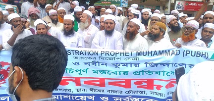 ডেইলি গাজীপুর প্রতিবেদক : গাজীপুর মহানগরের পূবাইল থানাধীন মিরের বাজারে পূবাইল থানা উলামা মাশায়েখ ও সর্বস্তরের জনগনের উদ্যোগে ভারতের ক্ষমতাসীন দল বিজেপি’র দুইজন নেতা মহানবী হযরত মুহাম্মদ (সাঃ) সম্পর্কে বিতর্কিত মন্তব্য করার প্রতিবাদে মঙ্গলবার সকালে মানববন্ধন ও আলোচনা সভা অনুষ্ঠিত হয়েছে। কর্মসূচিতে অংশগ্রহণকারীরা বলেন, ভারতের এই বিজেপি হিন্দুত্ব বাদি সরকার এবং নেতৃবৃন্দ মহানবী হযরত মুহাম্মদ (সাঃ) কে নিয়ে কটুক্তি করে এবং মুসলিমদের অবমাননা করে কথা বলে। এর তীব্র নিন্দা জ্ঞাপন করছি। পৃথিবীর সকল মুসলিমদের আহŸান জানাই তারা যেন ভারতসহ যে রাষ্ট্রই এমন আচরণ তাদের প্রতি কঠোর ব্যবস্থা গ্রহণ করে। মহানবী হযরত মুহাম্মদ (সাঃ) কে ভারতের বিজেপি’র মুখপাত্র নুপুর শর্মা ও নবীন কুমার যে মন্তব্য করেছেন তা ন্যাক্কারজনক। ভারতের সরকার দলীয় নেতারা প্রতক্ষ্য উদ্দেশ্য প্রনোদিতভাবে ইসলাকে অবমাননা করে। রাসুল (সাঃ) কে নিয়ে কটুক্তি করে। এর প্রতিবাদে আজ আমরা এখানে সমবেত হয়েছি। এ সময়ে উপস্থিত ছিলেন, পূবাইল থানা উলামা মাশায়েখ এর সভাপতি মুফতি শামসুদ্দিন খন্দকার। পূবাইল থানা উলামা মাশায়েখ এর সাধারণ সম্পাদক মাওলানা সাইদুল হক। ৪০নং ওয়ার্ডের উলামা মাশায়েখ এর সভাপতি মুফতি জয়নাল আবেদীন। পদহারবাইদ পূর্ব পাড়া জামে মসজিদের ইমাম মাওলানা মাহাদী হাসান সিরাজি, মুফতি আবু সাইদ, মুফতি হাবিবুর রহমান, আওলাদ ভান্ডারী প্রমুখ।