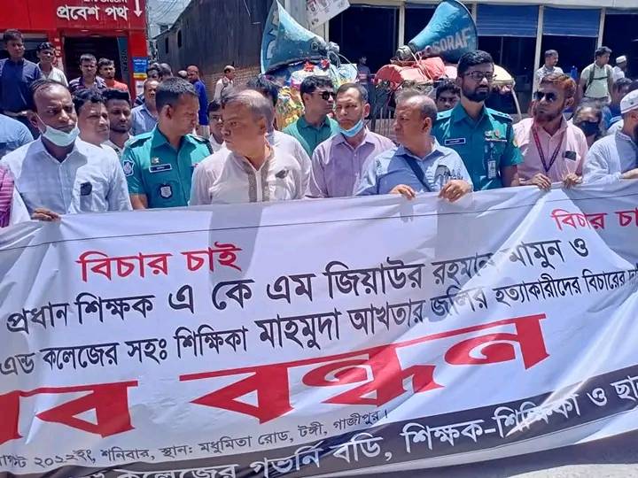 নাসির উদ্দীন বুলবুল: টঙ্গীর আলোচিত শিক্ষক দম্পতির রহস্যজনক হত্যা কান্ডের বিচারের দাবিতে ফুঁসে উঠছে শিক্ষার্থীরা। আজ সকালে মহাসড়কের এক পাশ বন্ধ করে মানববন্ধন ও প্রতিবাদ সভা করেছে বিভিন্ন স্কুলের শিক্ষার্থীরা। টঙ্গীর শহীদ স্মৃতি উচ্চ বিদ্যালয়ের প্রধান শিক্ষক জিয়াউর রহমান মামুন ও তার সহধর্মিণী আমজাদ আলী গার্লস স্কুলের সহকারী শিক্ষক মাহমুদা আক্তার জলির রহস্যজনক মৃত্যুর প্রতিবাদে শনিবার বেলা ১১ টা থেকে দুপুর ১ টা পর্যন্ত দুই প্রতিষ্ঠান সহ অন্যান্য স্কুলের সামনে আলাদা আলাদা মানববন্ধন ও প্রতিবাদ সভা অনুষ্ঠিত হয়। আমজাদ আলী গার্লস স্কুলের ছাত্রীরা বেলা ১১ টায় ঢাকা ময়মনসিংহ মহা সড়কে এবং শহিদ স্মৃতি উচ্চ বিদ্যালয়ের শিক্ষার্থীরা দুপুর ১২ টায় বিসিক সড়কে অবস্থান করে এ শিক্ষক দম্পতি হত্যাকান্ডের দ্রুত দৃষ্টান্তমূলক শাস্তির দাবি জানান। প্রতিবাদ সভা ও মানববন্ধন ২ টিতে সংহতি প্রকাশ করে সুষ্ঠু তদন্তর্পূবক এ হত্যাকান্ডের সাথে জড়িতদের গ্রেফতারসহ বিচার দাবি করে বক্তব্য রাখেন, জেলা শিক্ষা অফিসার রেবেকা সুলতানা, আমজাদ আলী গার্লস স্কুলের প্রধান শিক্ষক আব্দুর রাজ্জাক, ম্যানেজিং কমিটির সদস্য মহিউদ্দিন খান সেলিম, আশরাফ টেক্সটাইল মিলস স্কুলের প্রধান শিক্ষক আনোয়ার হোসেন, গাজীপুর প্রাইভেট স্কুল এসোসিয়েশনের সহ – সভাপতি সৈয়দ আতিক,জাতীয় সাংবাদিক সোসাইটির মহাসচিব নাসির উদ্দিন বুলবুল, শহিদ স্মৃতি উচ্চ বিদ্যালয়ের সহকারী প্রধান শিক্ষক নুরুজ্জামান রানা, সিনিয়র শিক্ষক আব্দুস সাত্তার, মোতাহার হোসেন, শিলমুন উচ্চ বিদ্যালয়ের প্রধান শিক্ষক মনিরুজ্জামান,নোয়াগাঁও এম এ মজিদ মিয়া উচ্চ বিদ্যালয়ের ভারপ্রাপ্ত প্রধান শিক্ষক আমজাদ হোসেন, টি এন্ড টি আর্দশ উচ্চ বিদ্যালয়ের প্রধান শিক্ষক জাহিদুর রহমান প্রমুখ। বক্তারা বলেন, দ্রুত সময়ের মধ্যে এ হত্যাকান্ডের প্রকৃত রহস্য উন্মোচন করে দায়ীদের দৃষ্টান্তমূলক শাস্তির আওতায় আনা না হলে টঙ্গী ও গাজীপুরের সকল শিক্ষা প্রতিষ্ঠানের শিক্ষক, শিক্ষার্থী ও অভিভাবকদের নিয়ে বৃহত্তর আন্দোলনের ডাক দেয়া হবে।